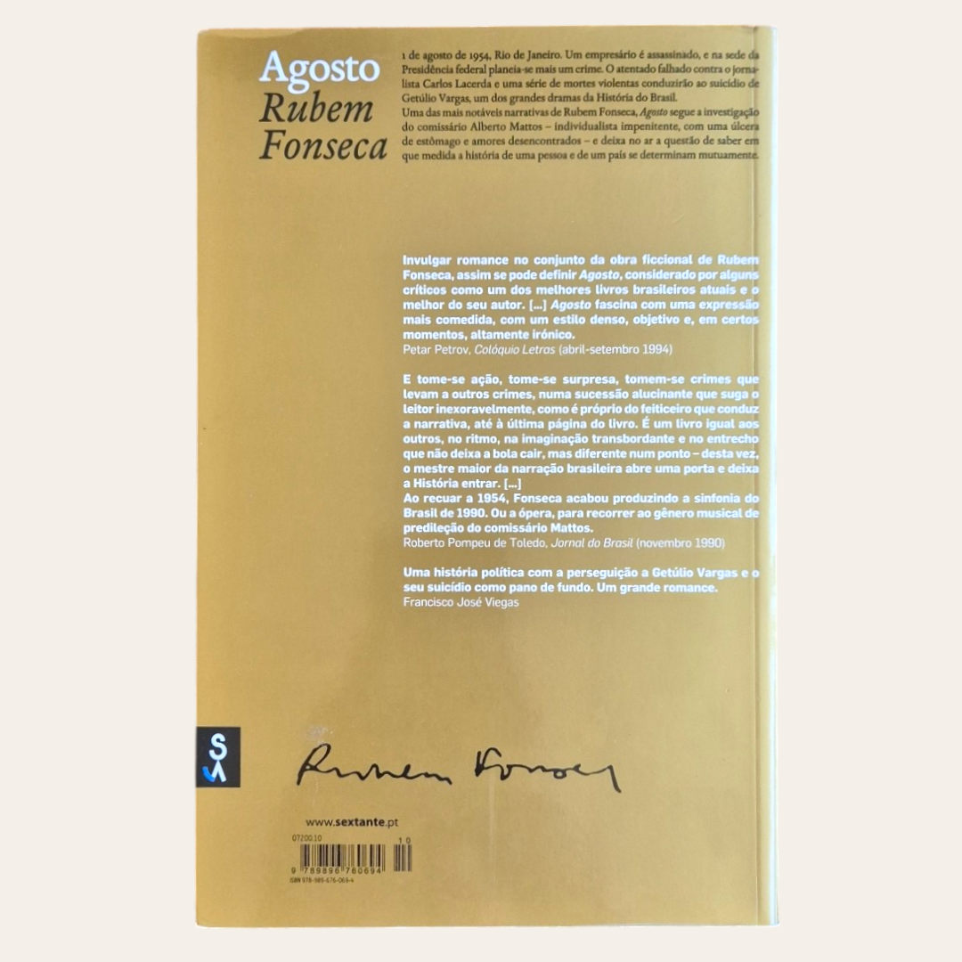 Uma das mais notáveis narrativas de Rubem Fonseca, Agosto segue a investigação do comissário Alberto Mattos - individualista impenitente, com uma úlcera de estômago e amores desencontrados - e deixa no ar a questão de saber em que medida a história de uma pessoa e de um país se determinam mutuamente.