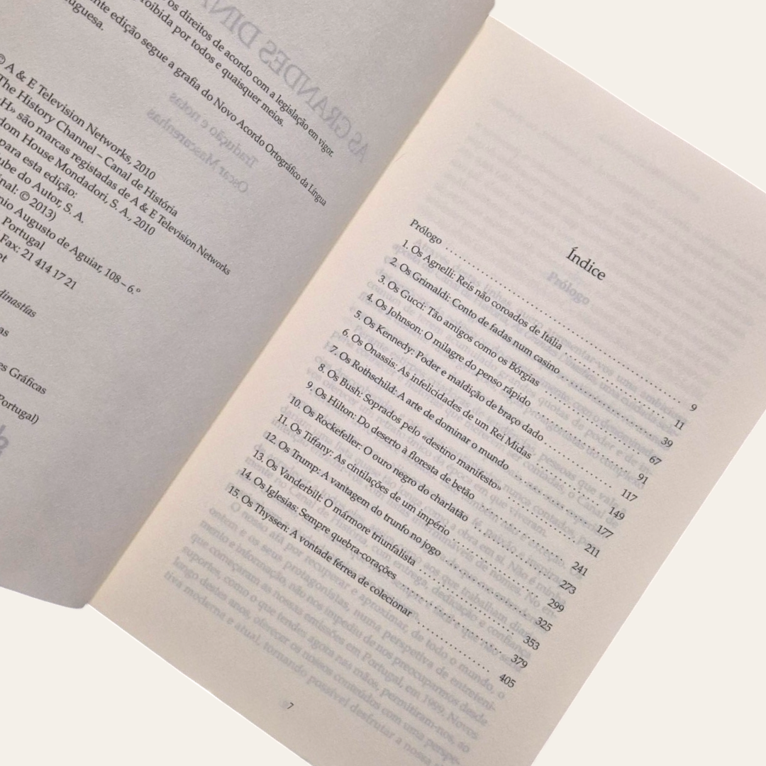 O poder e a maldição da família Kennedy; o conto de fadas dos Grimaldi; dinheiro e ócio dos Gucci; a resistência dos Agneli, os senhores da Fiat; Onassis, o Rei Midas; a família Bush, os Hilton e os Rockefeller, o império Tiffany e os trunfos dos Trump, entre outras. Em As Grandes Dinastias relata-se com pormenor e rigor a emocionante história dos empreendedores que construíram impérios, que criaram estilos, marcaram tendências e alcançaram o reconhecimento público mundial.