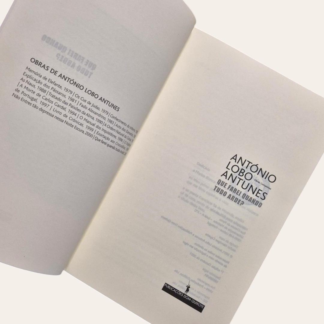 Décimo quinto romance de António Lobo Antunes, este livro é narrado por Paulo, o filho de um travesti ("Quis escrever um livro sobre a identidade, fazendo várias interrogações que se colocam de um modo especial num travesti.", Lobo Antunes em entrevista à Visão). O título, "Que Farei Quando Tudo Arde", é o último verso de um soneto de Sá de Miranda e, na altura em que o livro sai, não poderia ser mais actual. Como actual é o que se passa dentro do romance (o antepenúltimo, segundo o autor: "Só quero escrever mais dois romances."), continuando Lobo Antunes a fazer um retrato do país."Quando tudo arde".