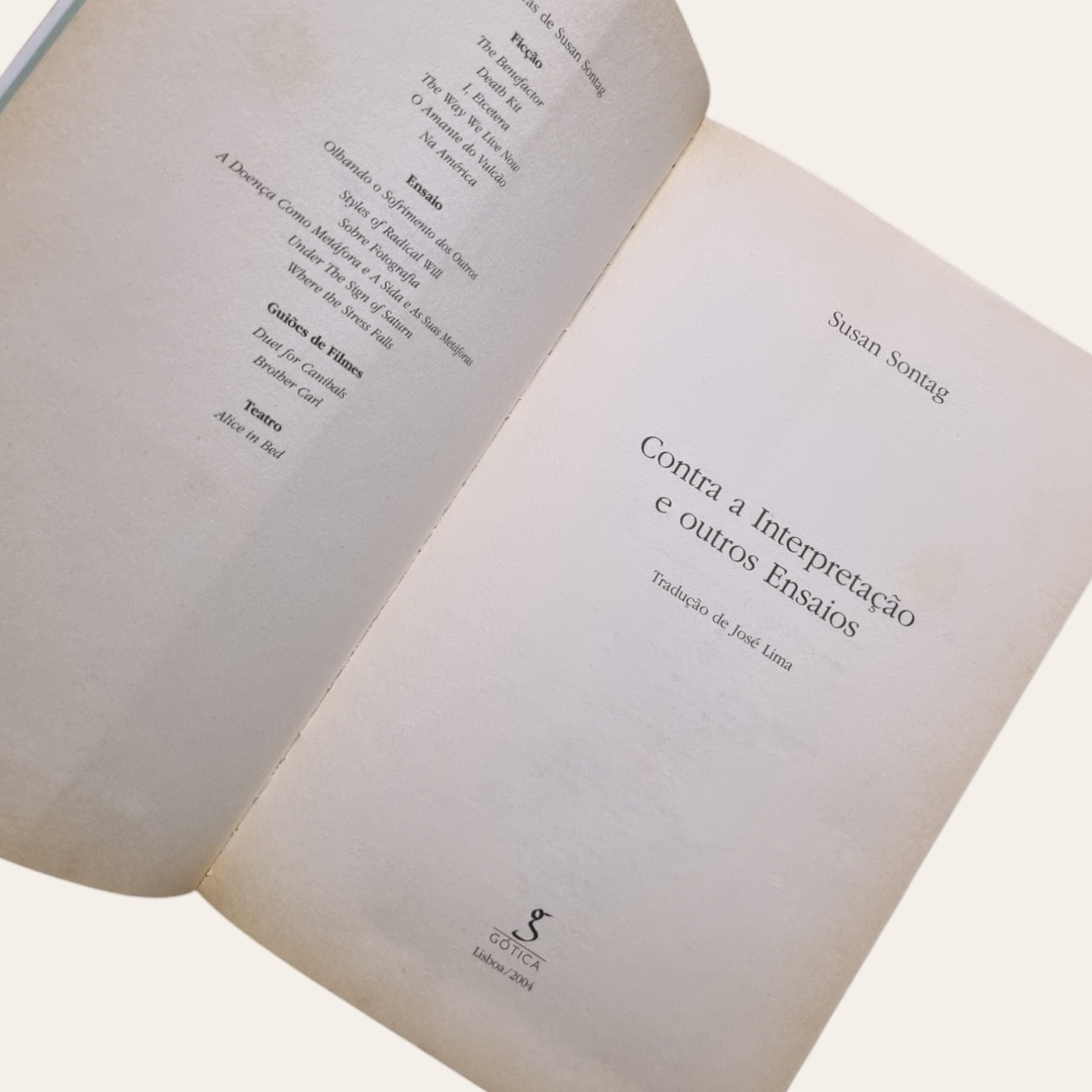 «Contra a interpretação» é um dos mais célebres ensaios de Susan Sontag e o que dá título à sua primeira coletânea de ensaios e recensões, publicada em 1966. Sobre estes escritos, Sontag observou que escrevia «com fervorosa parcialidade, acerca de problemas que […] suscitavam certas obras de arte, maioritariamente contemporâneas, de géneros diferentes: queria revelar e clarificar os pressupostos teóricos subjacentes a determinados juízos de valor e gostos». Entre eles, encontram-se «A morte da tragédia», «Notas sobre o camp», «Marat/Sade/Artaud» e «Sobre o estilo» (publicados na Partisan Review); «Os Cadernos de Camus» e «Ionesco» (New York Review of Books); «O artista como sofredor exemplar» (The Second Coming); «Uma cultura e a nova sensibilidade» (Mademoiselle); e «A imaginação da catástrofe» (Commen-tary), para nomear apenas alguns.