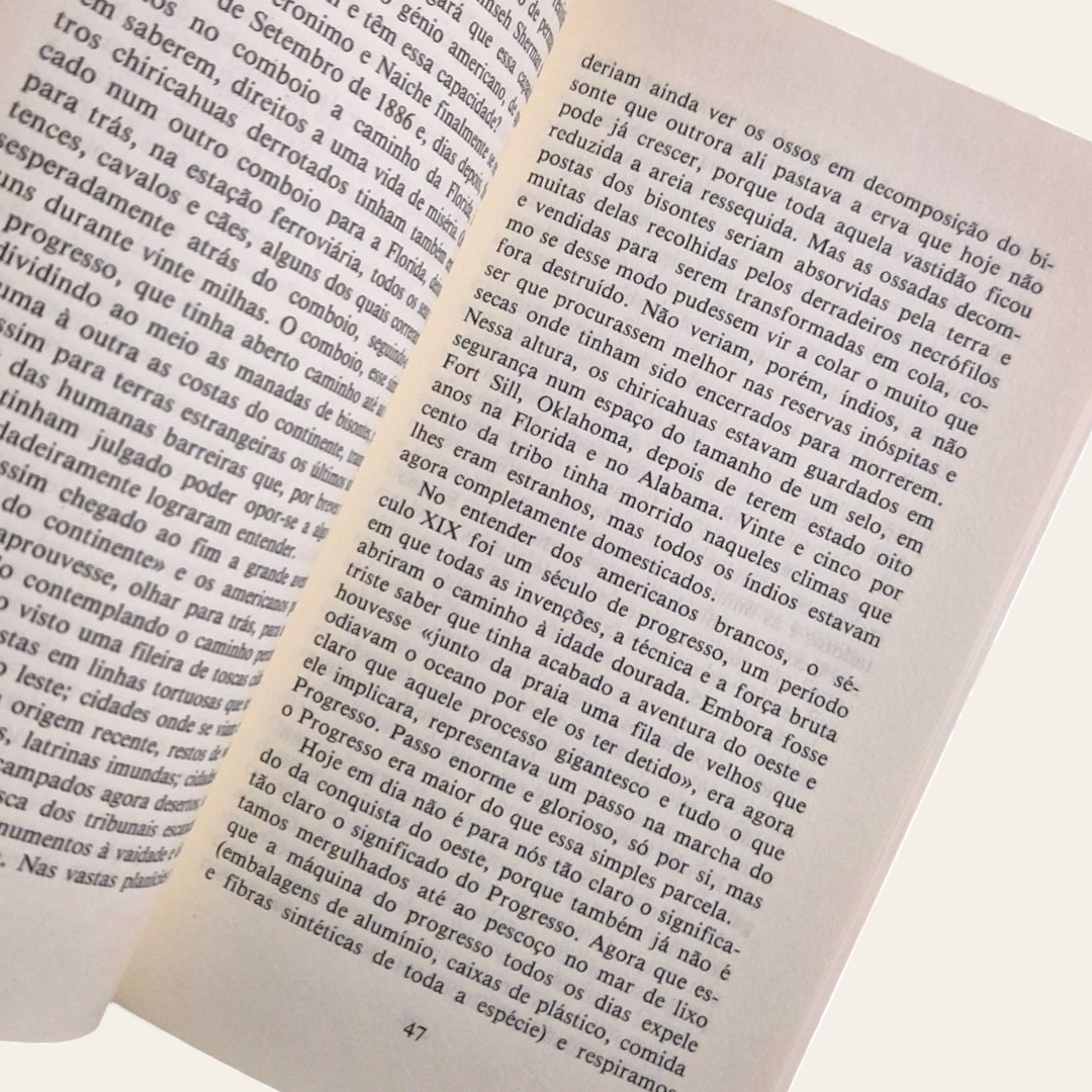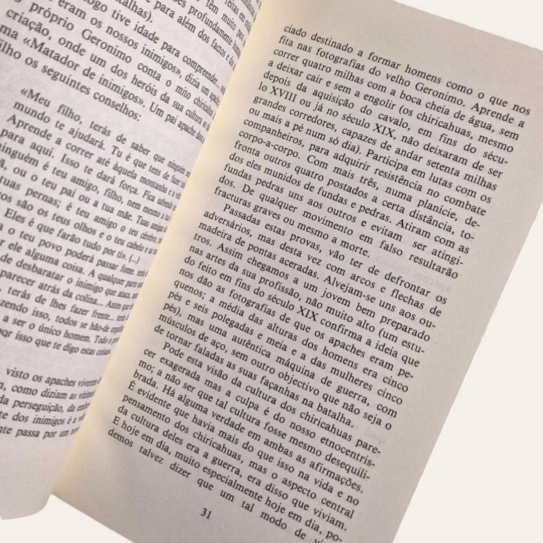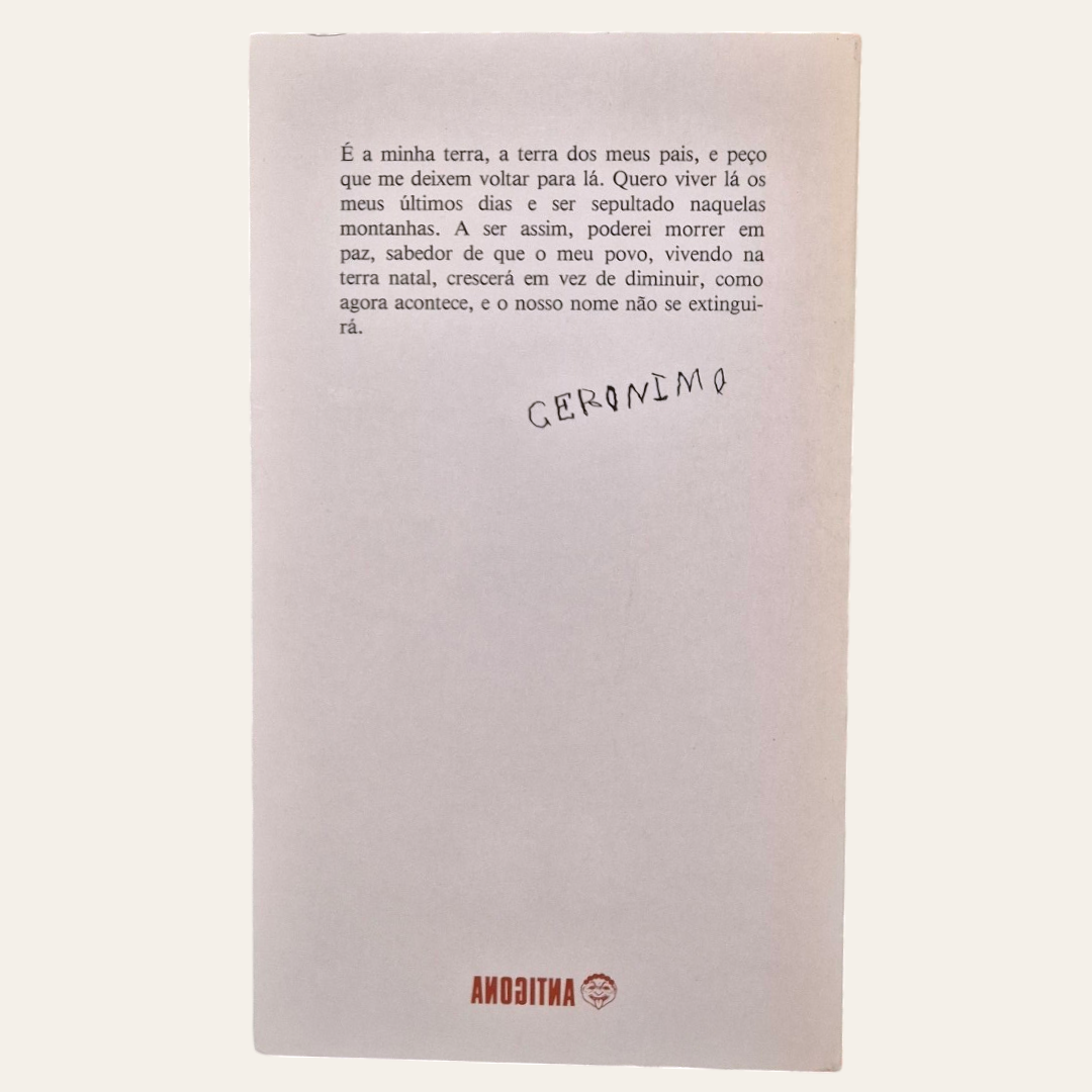 Geronimo terá nascido por volta de 1823, no actual Novo México, a montante do rio Gila. Foi capturado em 5 de Setembro de 1886 pelo general Nelson A. Miles junto à fronteira mexicana, depois de prolongada resistência à força da tropa branca. Os apaches chiricahuas que viviam perto do mundo natural num estado de equilíbrio entre Cultura e Natureza, onde não havia propriedade privada da terra, nem concentração do poder de Estado, acabaram por ser exterminados na guerra movida pela Democracia Americana, cujo objectivo parece ter sido a integração desses «primitivos» na Civilização a partir da designação geral de Progresso em que o ouro, a terra e a Glória também estavam incluídos. Este livro relata uma grande parte desse processo - etapa crucial da história dos povos índios e da sua conflitualidade com os brancos norte-americanos - em que o potencial revolucionário da existência primitiva se manifesta através do locus de Geronimo.