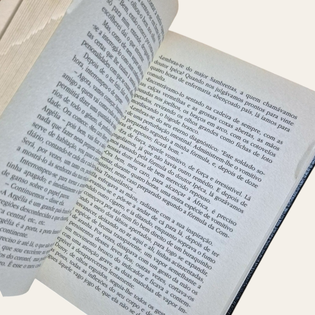 Evidencia ligeiros sinais de manuseamento a nível exterior, bem como um pequeno dano no corte frontal que praticamente não tem impacto nas páginas.