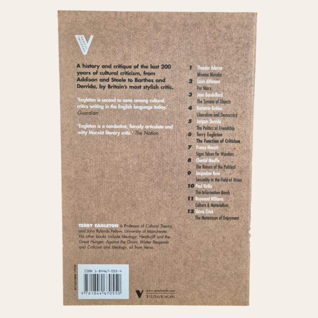 The Function of Criticism is nothing less than a history and critique of the “critical institution” itself. Eagleton’s judgements on individual critics are sharp and illuminating, which his general argument raises crucial questions about the relations between language, literature and politics.