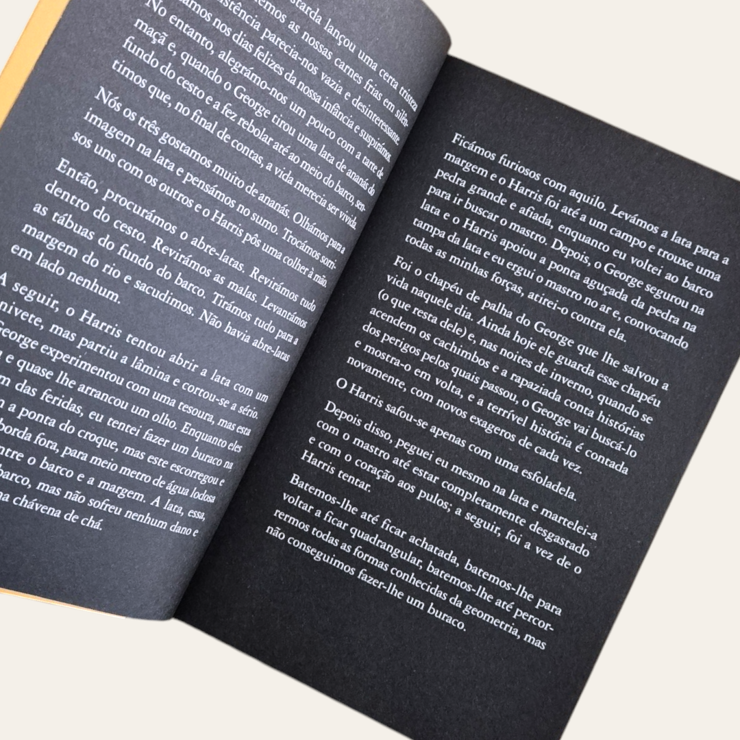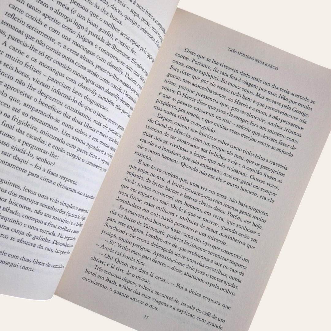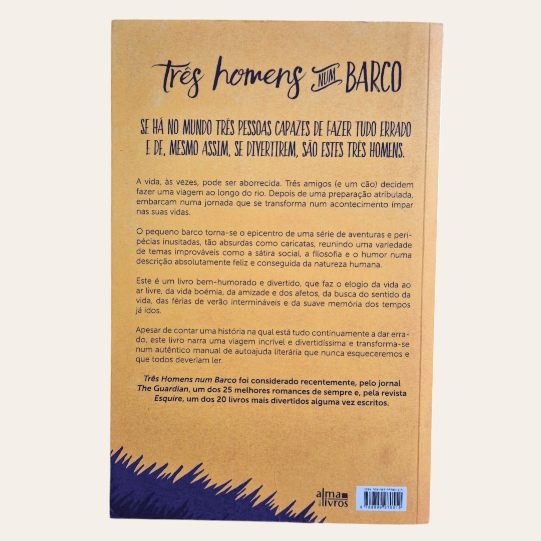 Apesar de contar uma história na qual está tudo continuamente a dar errado, este livro narra uma viagem incrível e divertidíssima e transforma-se num autêntico manual de autoajuda literária que nunca esqueceremos e que todos deveriam ler. Três Homens num Barco foi considerado recentemente, pelo jornal The Guardian, um dos 25 melhores romances de sempre, e um dos 20 livros mais divertidos alguma vez escritos, pela revista Esquire.