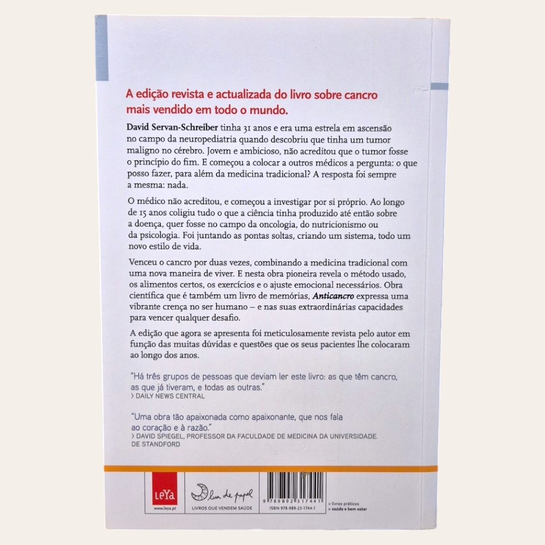 David Servan-Schreiber tinha 31 anos e era uma estrela em ascensão da neuropediatria quando descobriu que tinha um tumor maligno no cérebro. Jovem e ambicioso, não acreditou que fosse o princípio do fim. Começou a perguntar a outros médicos: O que posso fazer, para além da medicina tradicional? A resposta foi sempre a mesma: nada. David não acreditou, e começou a investigar por si próprio. Ao longo de 15 anos coligiu tudo o que a ciência tinha produzido sobre a doença, no campo da oncologia, do nutricionismo, da psicologia. Foi juntando as pontas soltas, criando um sistema, todo um novo estilo de vida. Venceu o cancro por duas vezes, combinando a medicina tradicional com uma nova maneira de viver. E nesta obra pioneira revela o método usado, os alimentos certos, os exercícios e o ajuste emocional necessários. Obra científica mas também um livro de memórias, Anticancro expressa uma vibrante crença no ser humano e nas suas extraordinárias capacidades para vencer qualquer desafio. A edição que agora se apresenta foi meticulosamente revista pelo autor em função das muitas dúvidas e questões que os seus pacientes lhe colocaram ao longo dos anos.