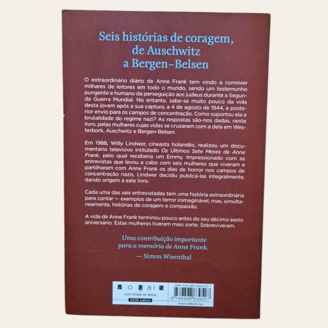 O extraordinário diário de Anne Frank tem vindo a comover milhares de leitores em todo o mundo, sendo um testemunho pungente e humano da perseguição aos judeus durante a Segunda Guerra Mundial. No entanto, sabe-se muito pouco da vida desta jovem após a sua captura, a 4 de agosto de 1944, e posterior envio para os campos de concentração. Como suportou ela a brutalidade do regime nazi? As respostas são-nos dadas, neste livro, pelas mulheres cujas vidas se cruzaram com Anne Frank em Westerbork, Auschwitz e Bergen-Belsen.